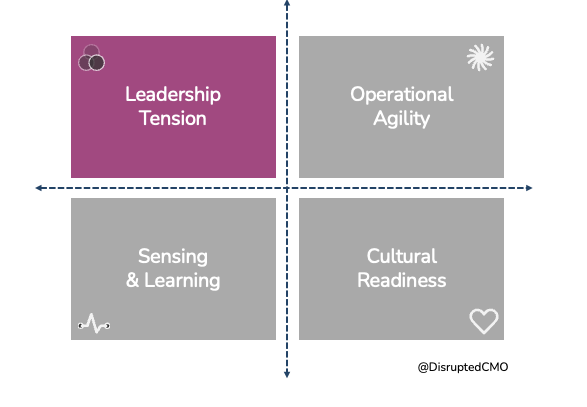 In the Disruption-Fluent Marketing framework, Leadership Tension is defined as "the degree to which marketing leaders effectively manage the polarities that define the dynamic interplay between the framework's leadership approaches." It draws from Complexity Leadership Theory, which identifies three "entangled" leadership functions: